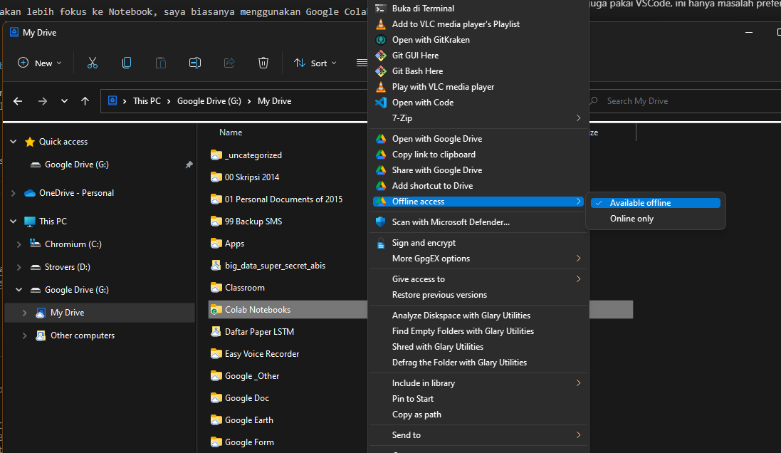 - Klik kanan pada folder Colab Notebookskemudian pilih “Offline Access” > “Available Offline” (Jika menggunakan Windows 11 pilih “Show more options”)